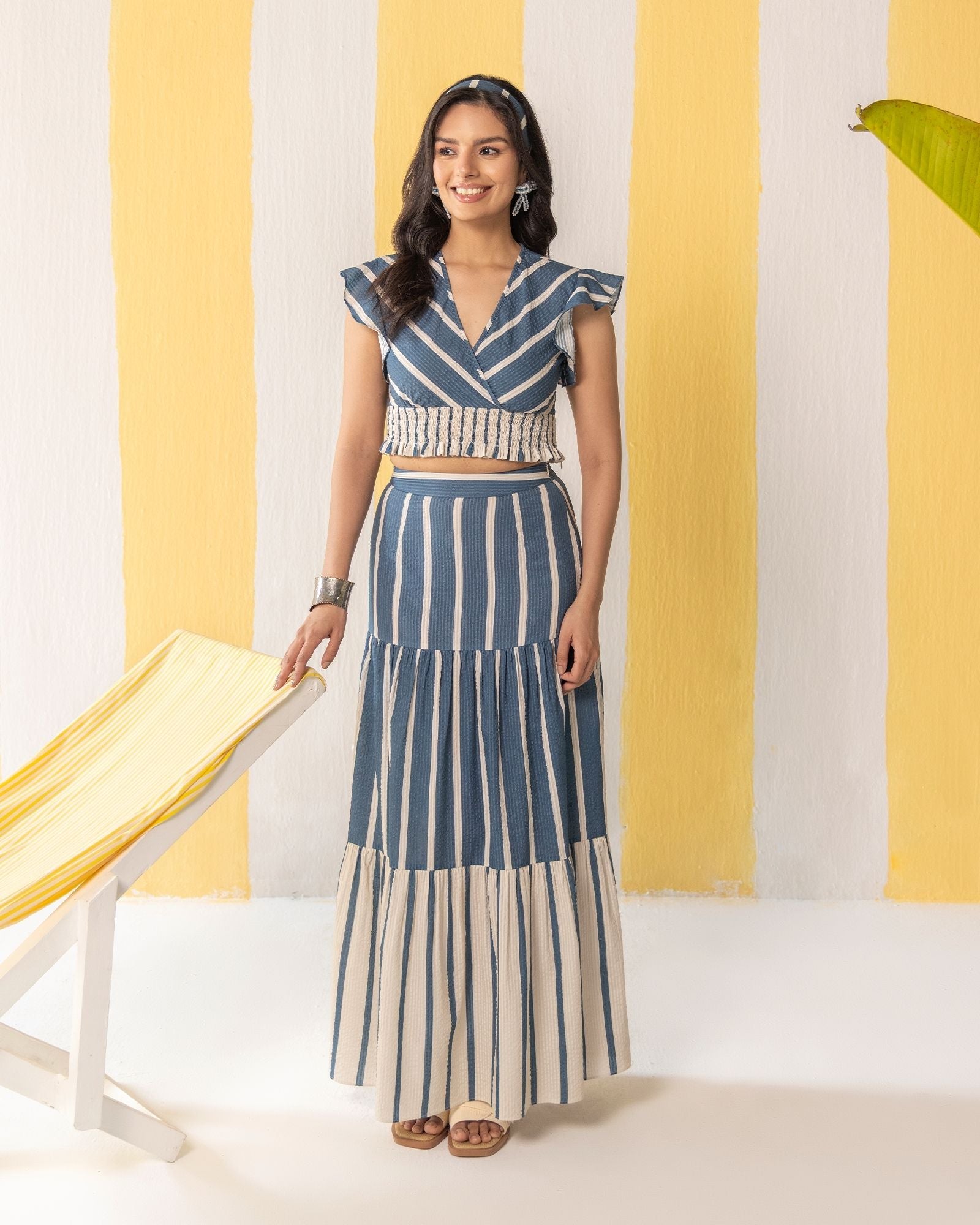 Blue & Beige Striped Skirt Set